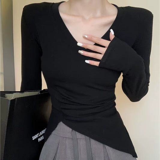 Autumn Korean Fashion Y2K T-Shirt Woman Japanese V-Neck Split Tee Shirt Women with Shoulder Pad Sexy Vintage Corset Tops Clothes