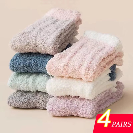 4 Pairs Women Thick Winter Warm Socks Fluffy Fuzzy Floor Sleep Kawaii Socks Colorful Cute Thermal White Soft Velvet Nylon Socks