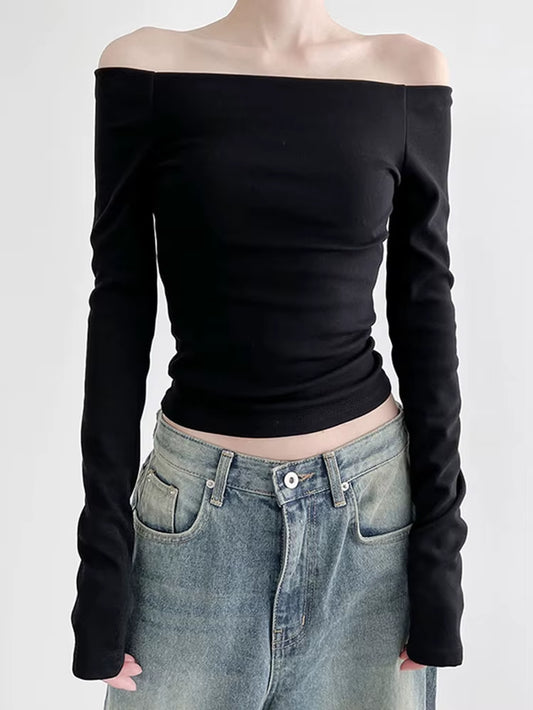 Black Solid Slash Neck Elegant Long Sleeve Tops Korean Fashion Slim Sexy Cropped T Shirt Women Fall Clothing